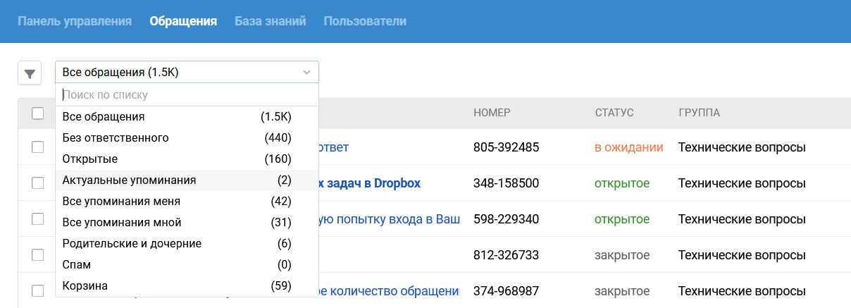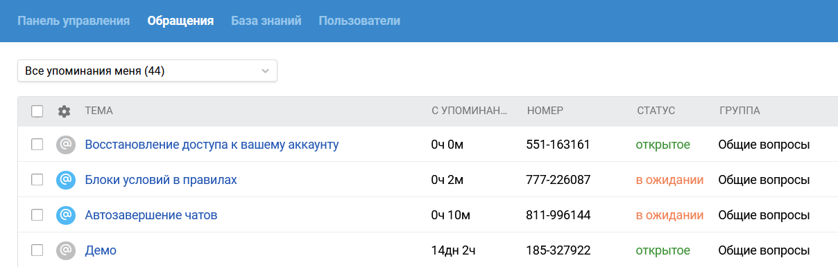 в. Все упоминания — как новые, так и старые — можно легко найти в стандартных фильтрах. Также с помощью фильтров можно найти обращения, в которых сотрудник упоминал своих коллег. Упоминания можно отсортировать от старых к новым и наоборот, а также производить массовые действия с ними. Подробнее об этих функциях тут.