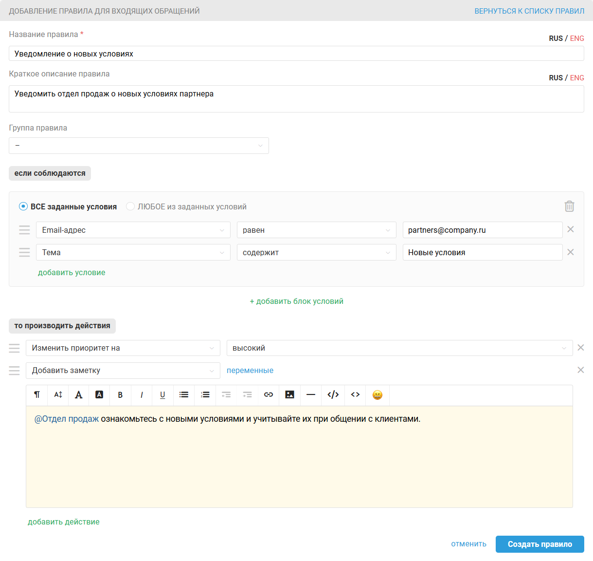 Чтобы отслеживать упоминания, в правилах для изменённых обращений есть специальное условие — «Добавлена заметка с упоминанием». С его помощью вы без проблем настроите нужную вам логику. Опции у этого условия следующие: