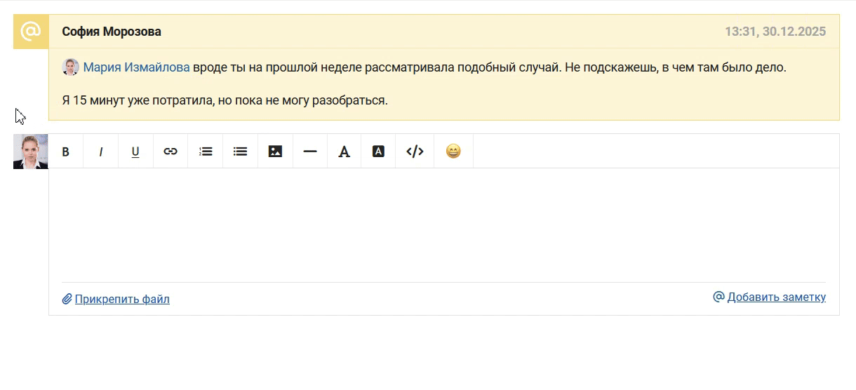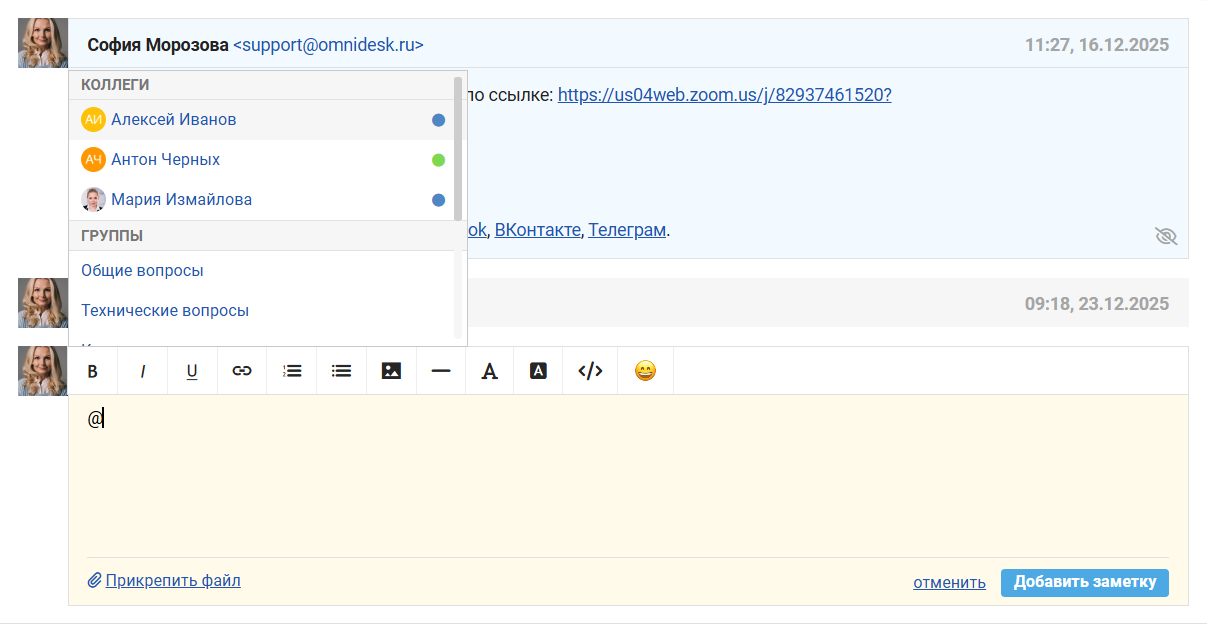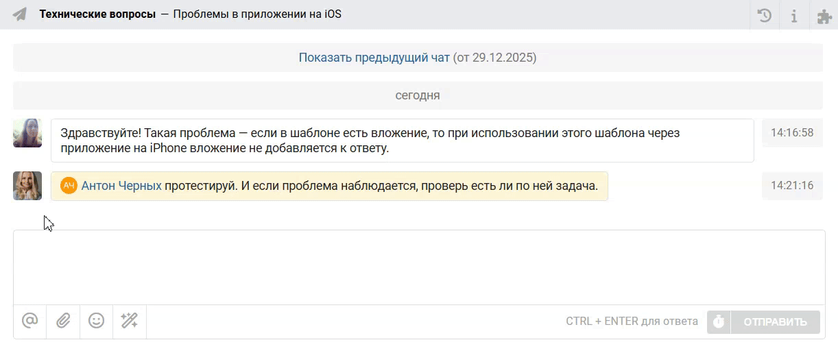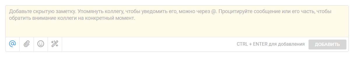 PRO подсказка: напечатайте «@» в пустом поле для написания ответа, чтобы быстро переключиться в режим заметки и увидеть список сотрудников и групп для упоминания.
