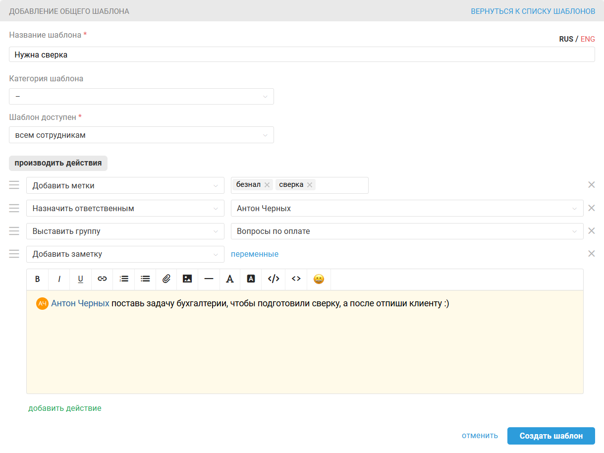 б. Шаблоны. Вы часто выставляете какую-то метку в обращении, а после упоминаете коллегу в заметке, чтобы попросить его поставить задачу бухгалтерии или обсудить вопрос с руководителем. Через шаблоны выполнять все эти действия значительно проще и быстрее.