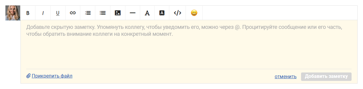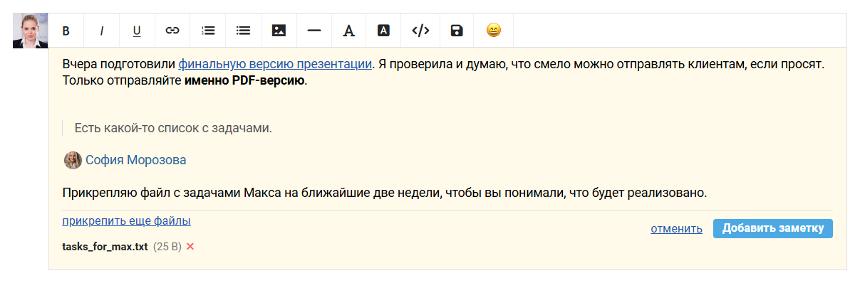 В этом случае мы сразу переключим вас в режим добавления заметки, вставим цитату и упомянем коллегу, заметку которого вы цитировали: