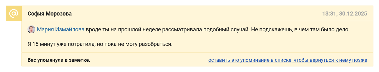 В заметках можно упоминать конкретного сотрудника или целую группу, чтобы обратить внимание коллег на определённый момент или задать уточняющий вопрос.