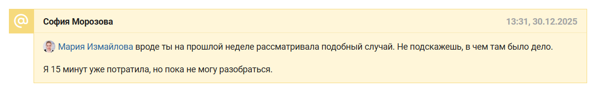 2. Сотрудник упомянул группу, уведомление увидели его коллеги. Если кто-то из коллег открыл обращение с упоминанием, оно в итоге не пропадает у всех остальных сотрудников.