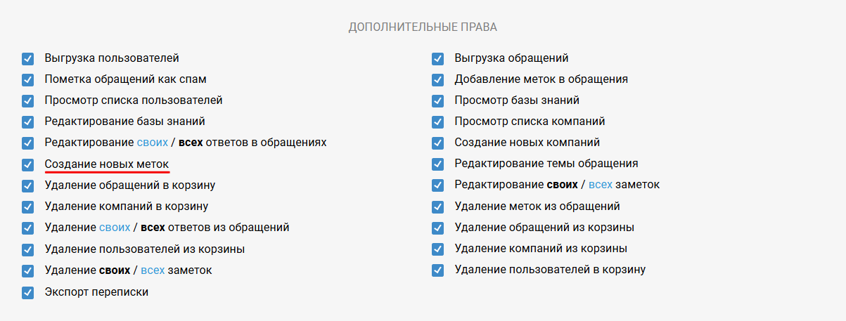 Если отмечен чекбокс «Добавление меток в обращения», но не отмечен «Создание новых меток», сотрудник может выбирать только те метки, которые уже созданы, но не может создавать новые.