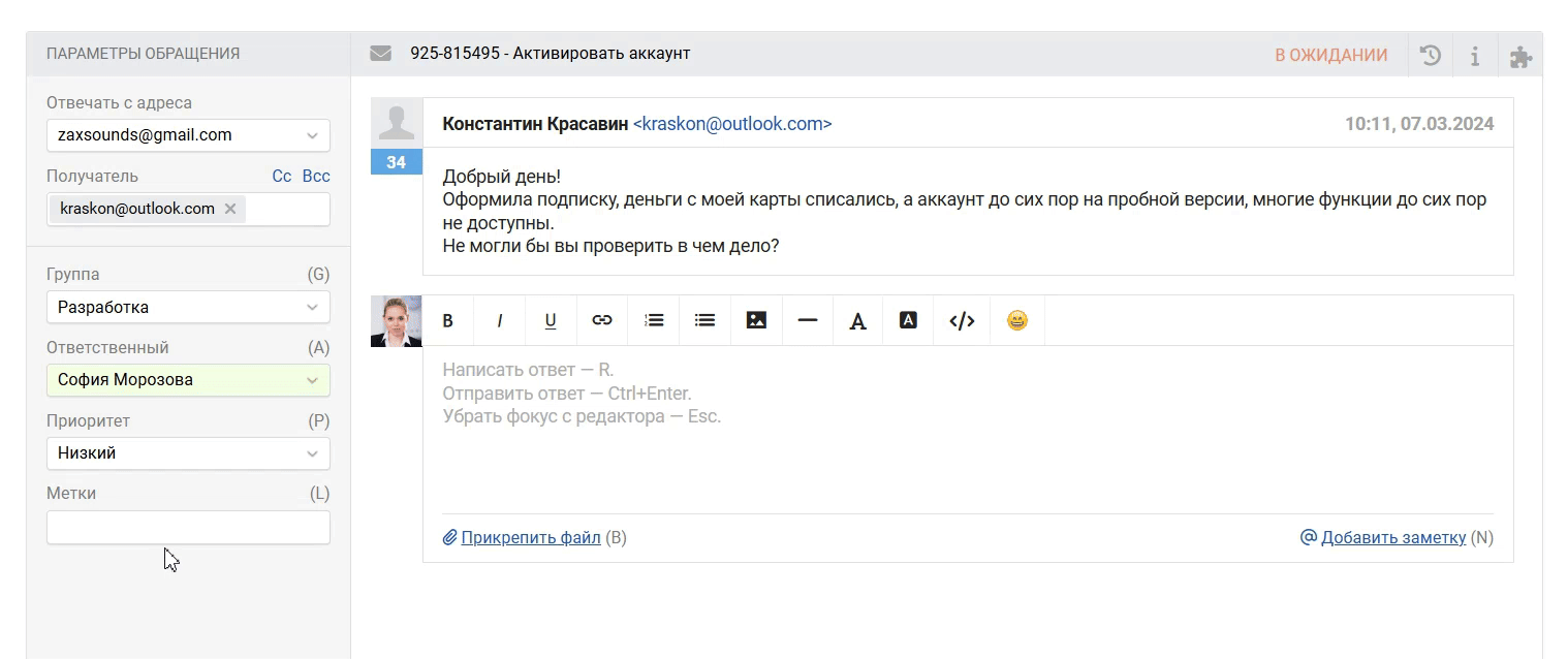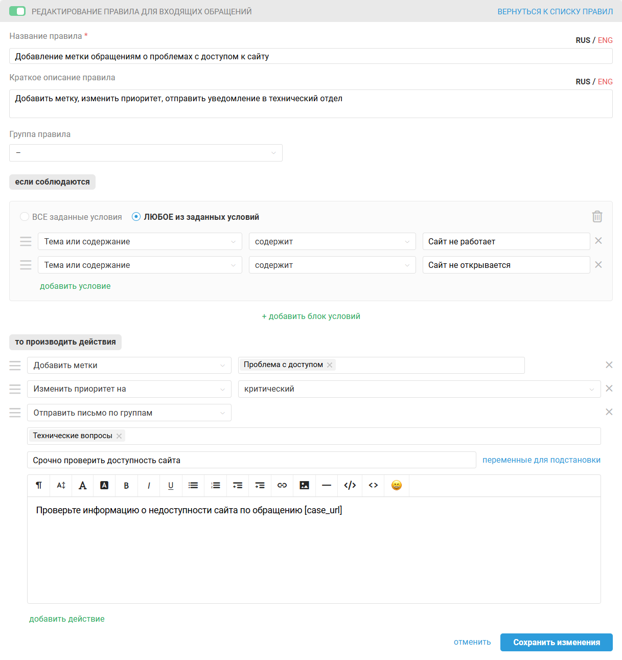 Например, если текст обращения содержит ключевые слова «Не могу зайти на сайт», «Сайт не работает», «Сайт не открывается», то обращению добавляется метка «Проблема с доступом», изменяется приоритет и отправляется уведомление в технический отдел.