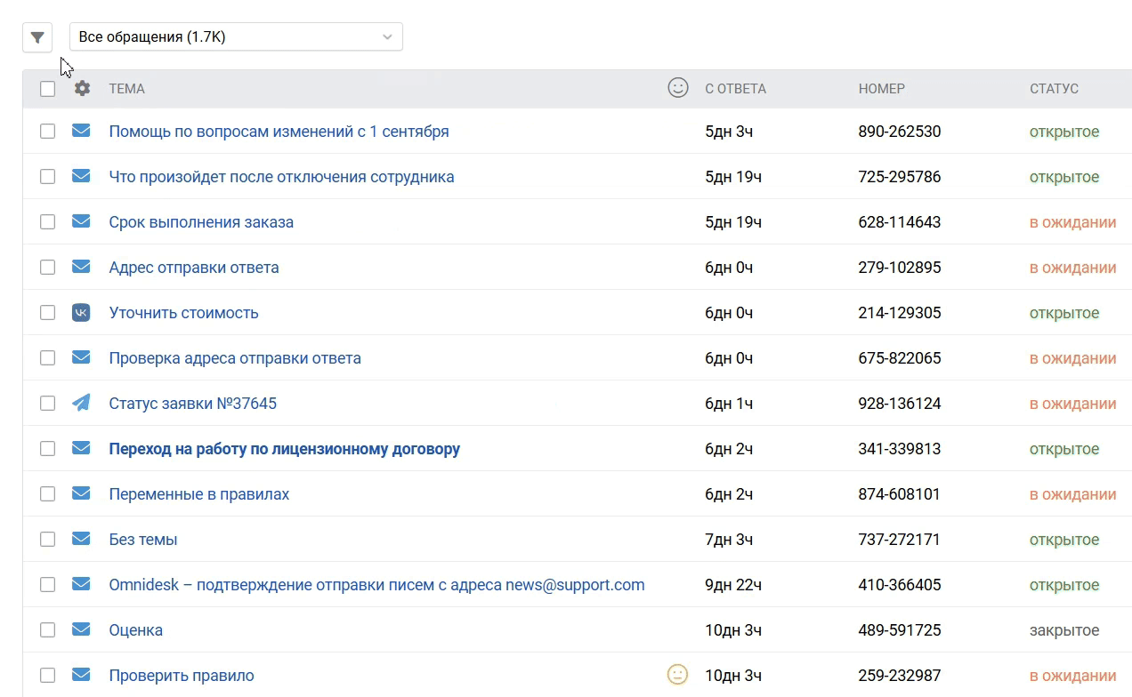 Метки в этом случае выполняют ту же роль. Помечаете обращения нужной меткой, создаёте соответствующий фильтр, а после просматриваете все обращения с этой меткой. Статус в этом случае можно назначить «в ожидании».