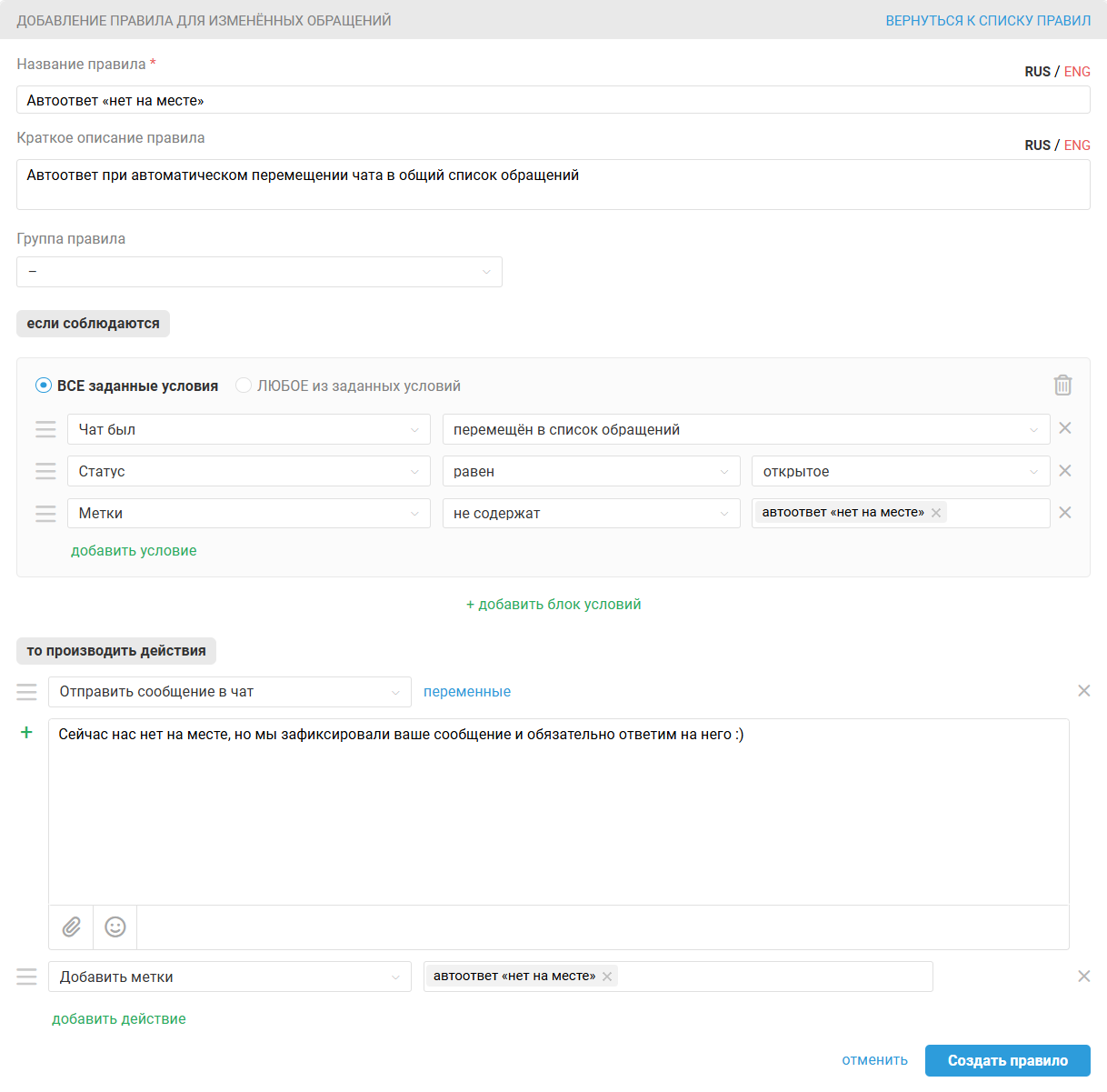 Настройте добавление меток обращениям, которые соответствуют определённым условиям.