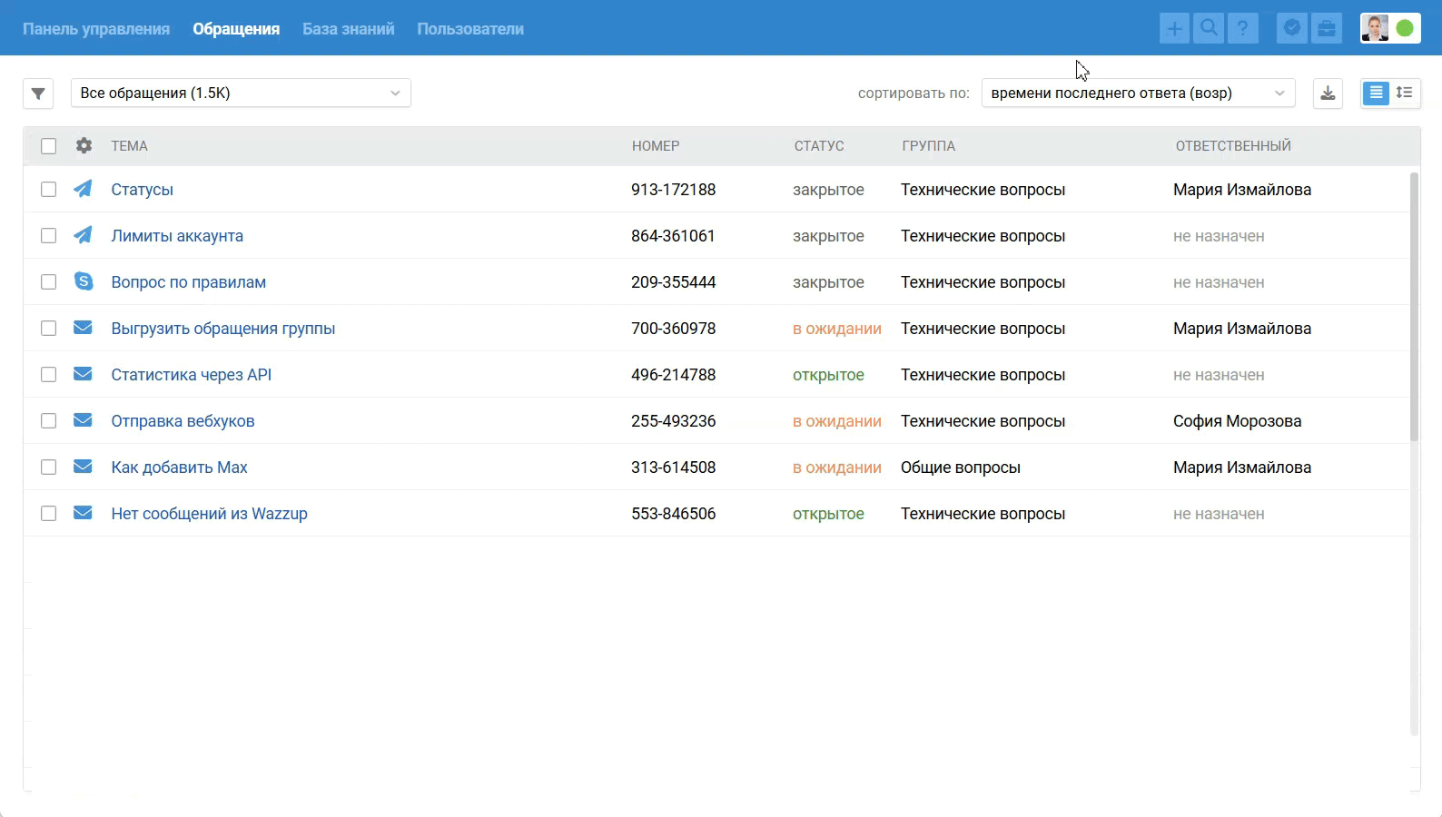 б) В правом верхнем углу профиля компании есть опция, которая позволяет контролировать, какие обращения видят пользователи компании: только свои или всей компании.