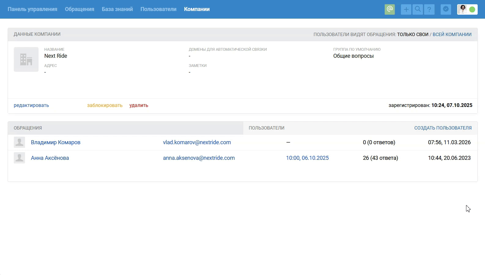 в) При просмотре пользователей компании в шапке списка есть ссылка «Создать пользователя» для быстрого добавления пользователя через модальное окно (по аналогии со ссылкой «добавить нового пользователя» на странице создания нового обращения).