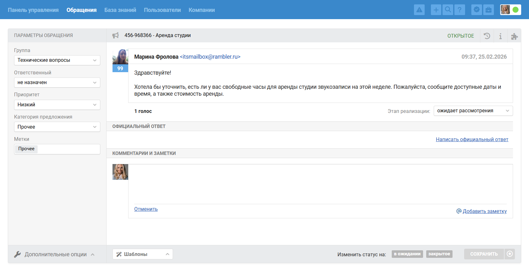 Если вы не хотите, чтобы пользователю отправилось уведомление о создании обращения, то выберите опцию «не отправлять письмо».