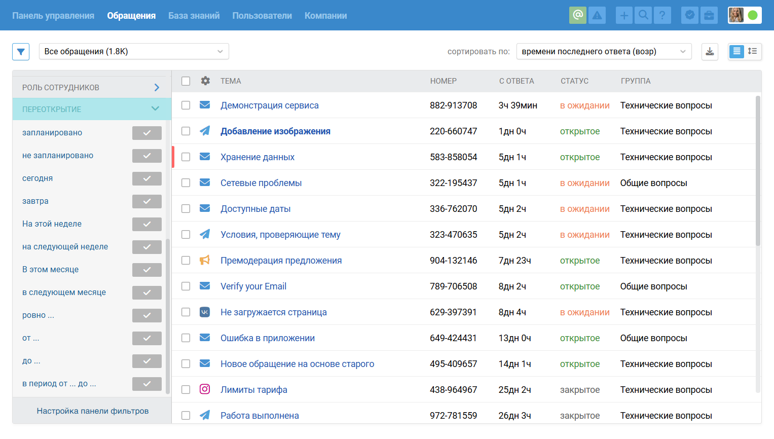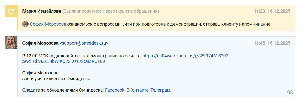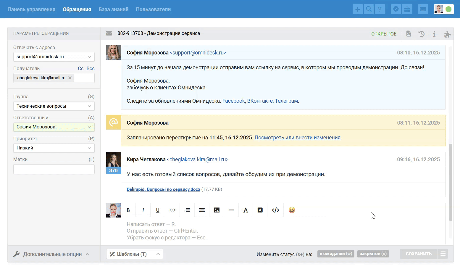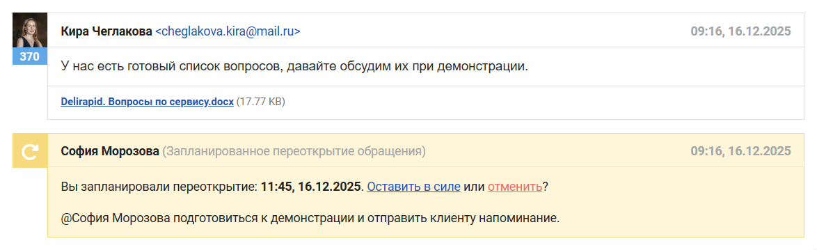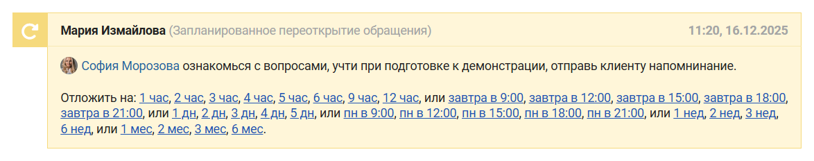 Функция переоткрытия обращений позволяет напомнить себе и коллегам о необходимых действиях.