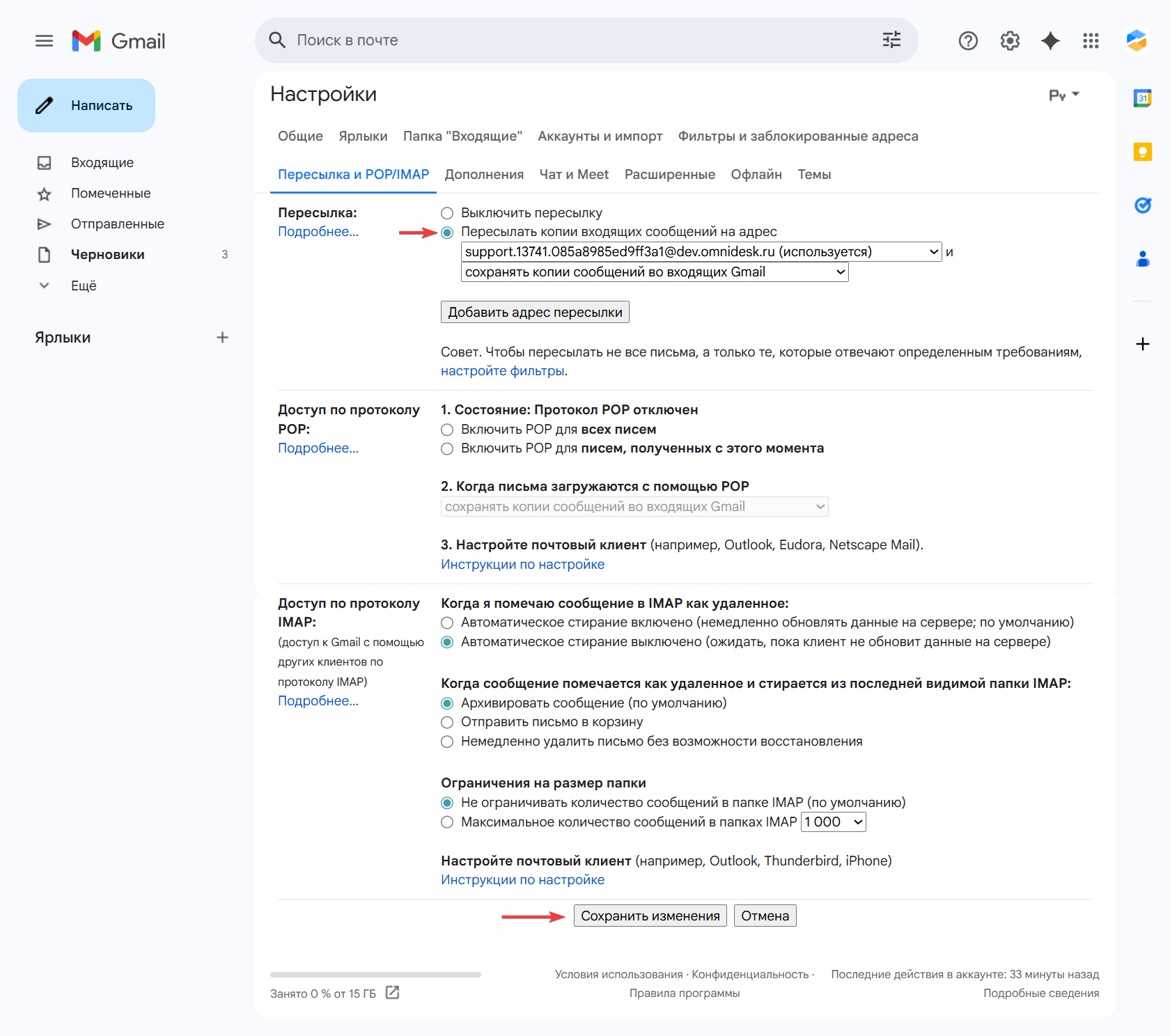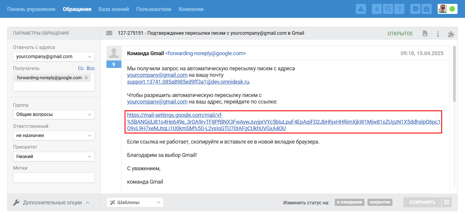 Не забудьте настроить пересылку в интерфейсе вашего почтового сервиса, чтобы письма клиентов поступали в Омнидеск.
