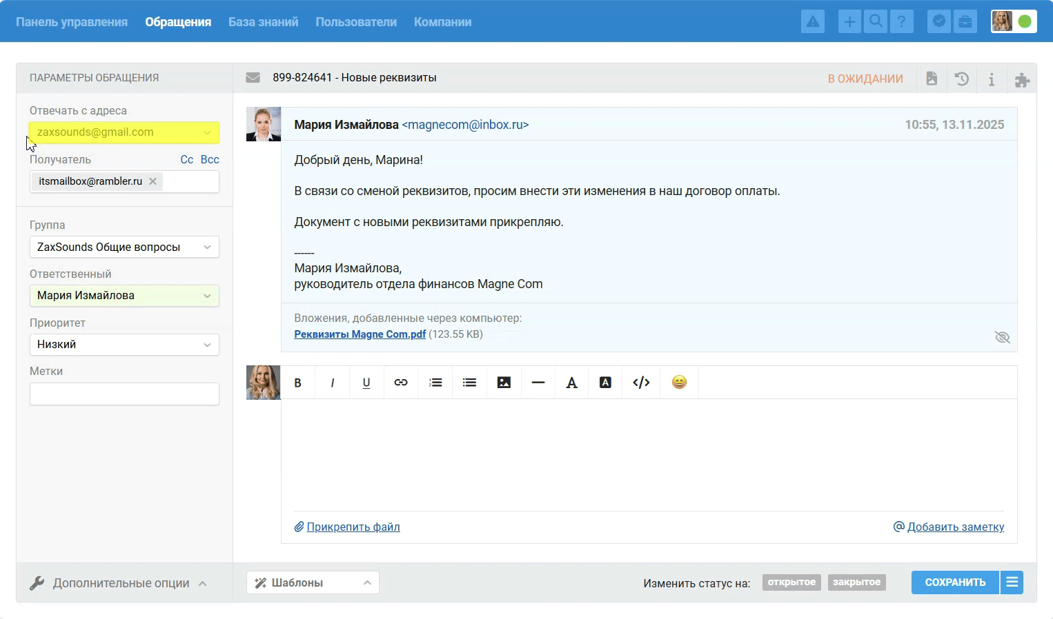 3. Когда в настройках ящиков указаны определённые группы, мы всегда проверяем соответствие выставленных ящика и группы на странице обращения и на странице создания обращения.