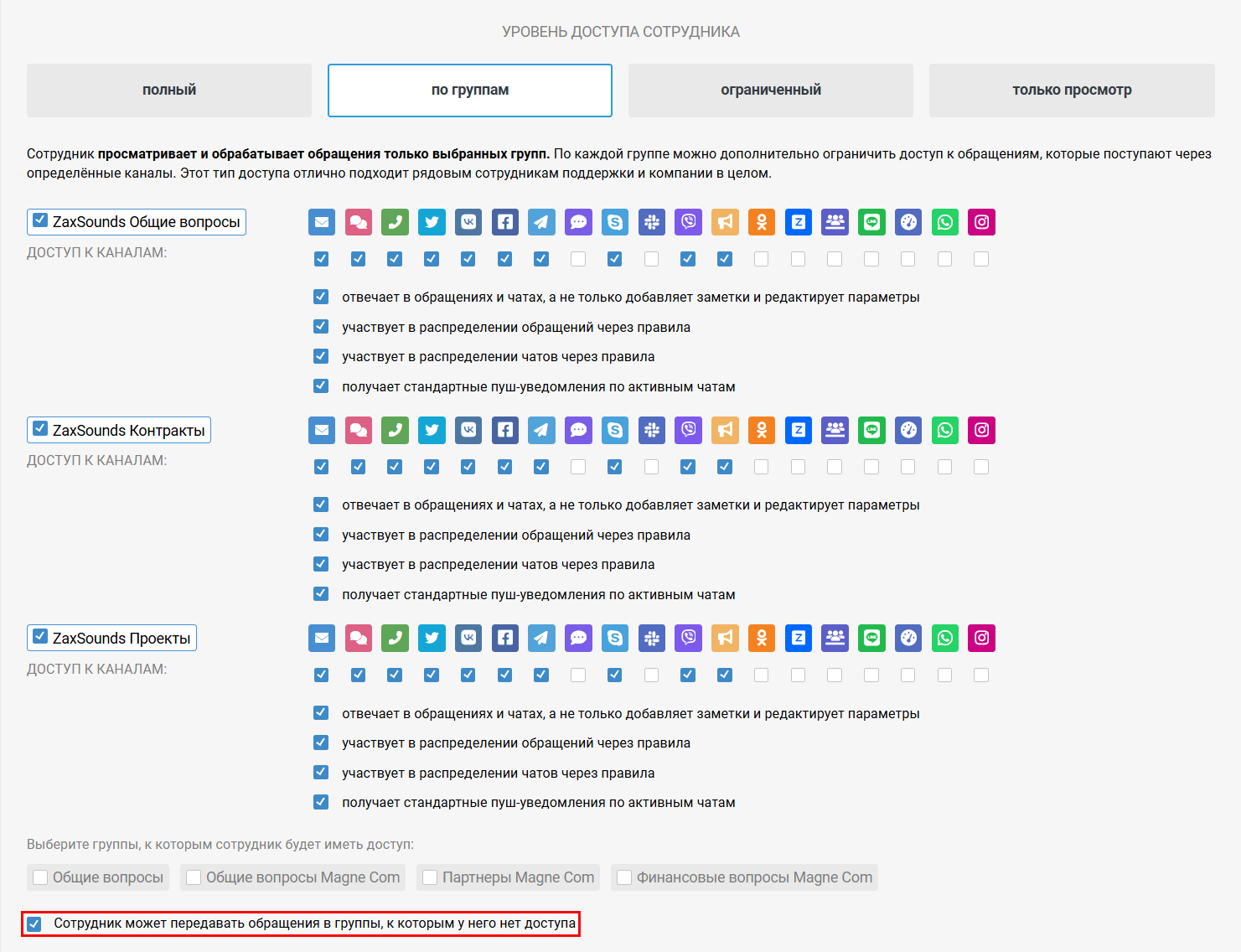 б) если он НЕ отмечен, то в списке групп в обращении сотрудник видит только те, к которым у него есть доступ.