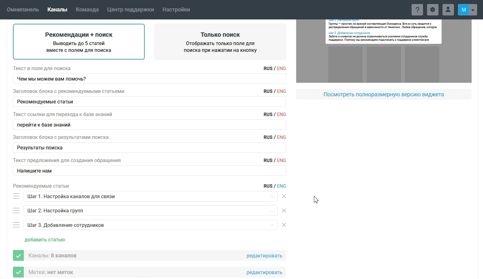 Добавьте все нужные вам каналы. При добавлении каналов «База знаний» и «Предложения» указывается подсказка, появляющаяся при наведении курсора, задаются иконка и её цвет, а также выбирается, какая страница / категория откроется по умолчанию.