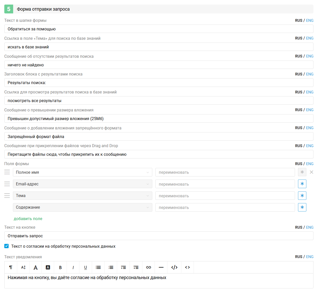 Когда ссылка на соглашение об обработке персональных данных добавлена в виджет, форма для отправки запроса получает следующий вид: