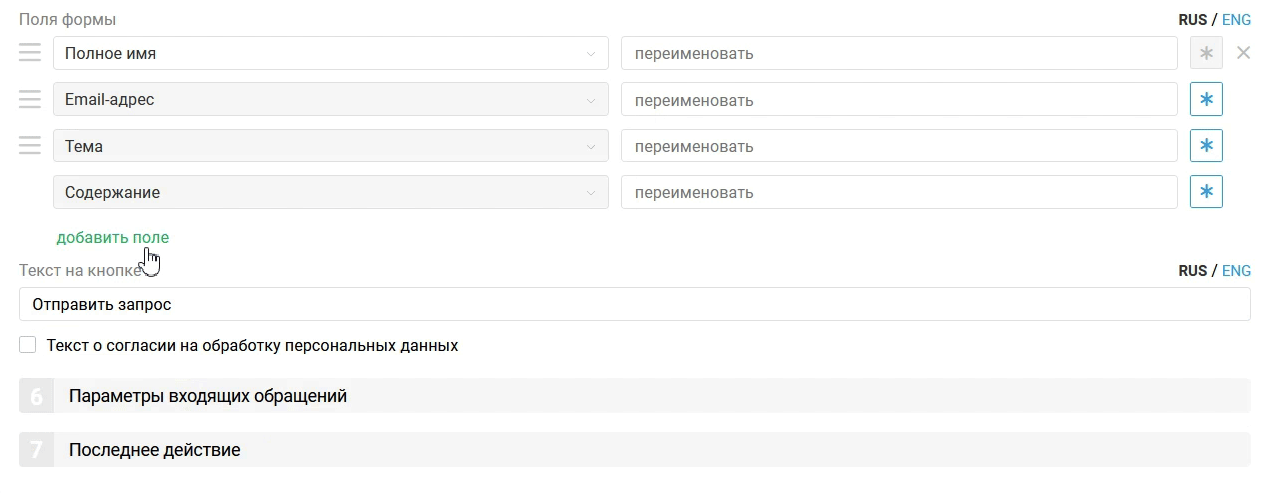 Затем добавьте нужные поля в форму обратной связи и укажите с помощью звездочки, будет ли оно обязательным для заполнения или нет.