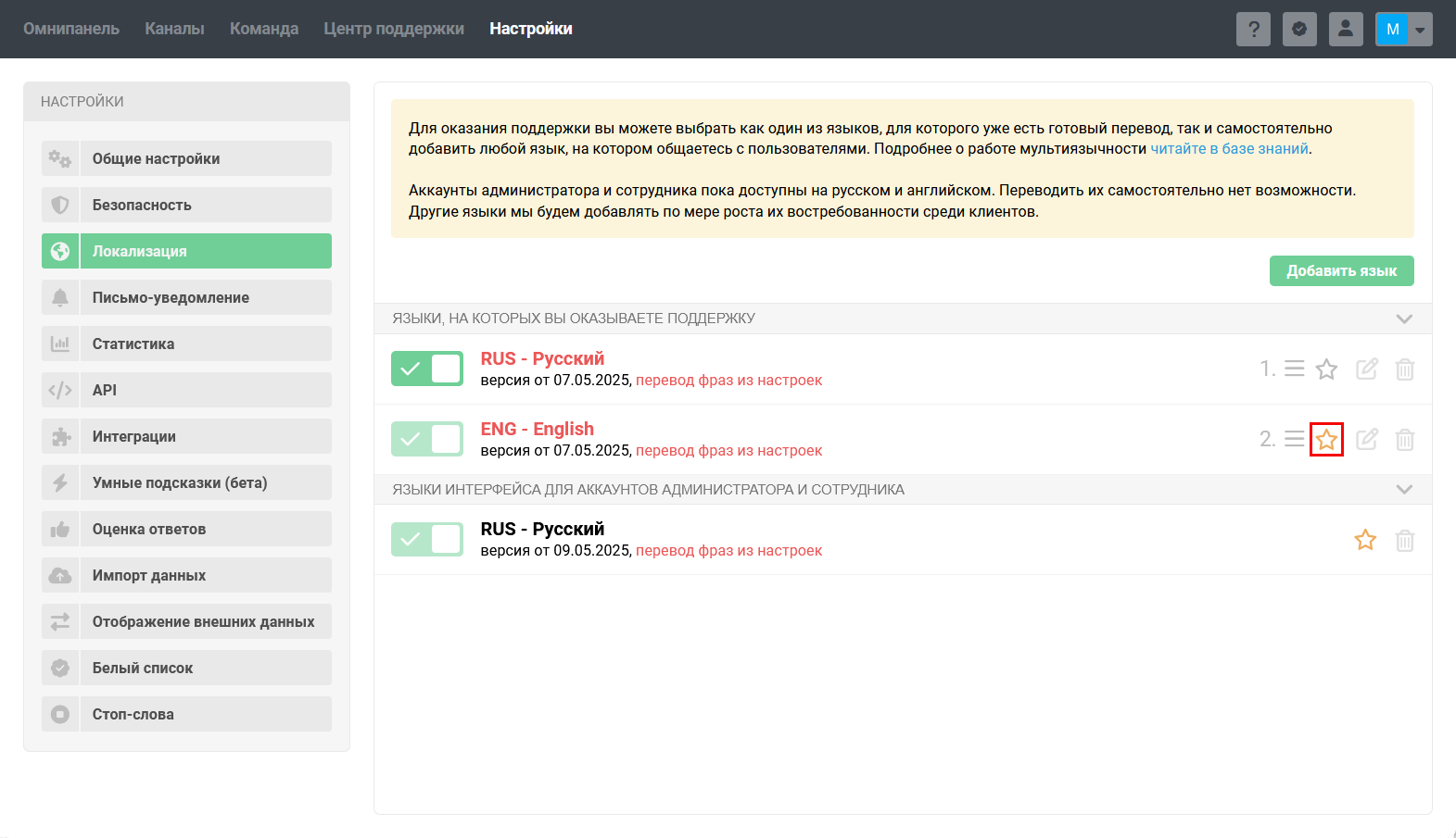 Если в браузере пользователя выставлен язык, который добавлен в вашем аккаунте в Омнидеске, то виджет отобразится именно на нем (при условии, что при создании виджета вы перевели все фразы виджета на этот язык). Если в браузере пользователя выставлен язык, которого НЕТ в вашем аккаунте в Омнидеске, то виджет отобразится на языке, установленном по умолчанию (отмеченном звёздочкой).