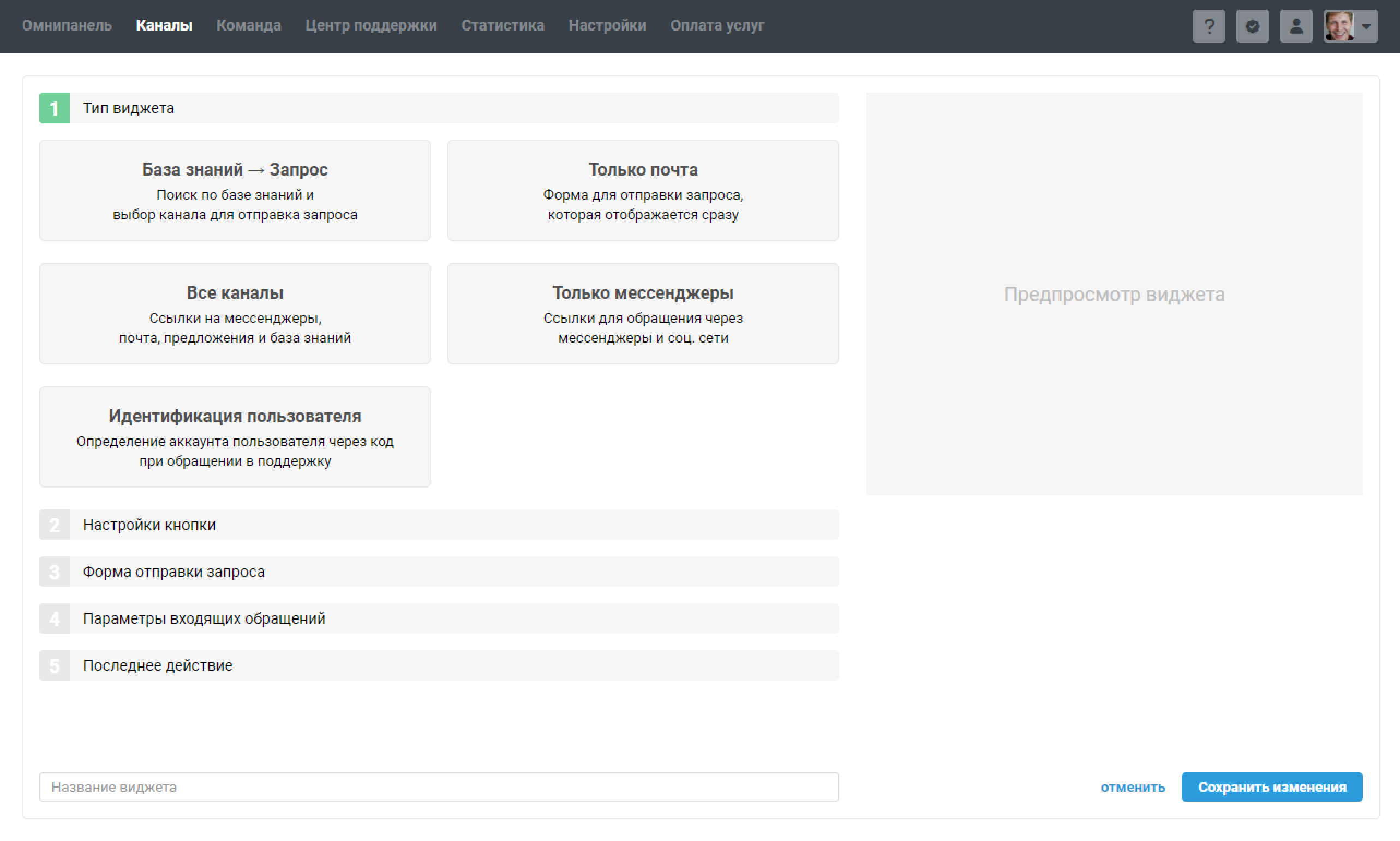 Создать виджет можно по пути аккаунт администратора — раздел «Каналы» — подраздел «Виджеты». Нажмите на кнопку «Добавить виджет», чтобы приступить к созданию и настройке виджета.