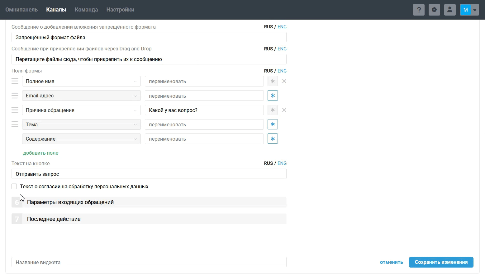 Если среди выбранных вами каналов будет почта, то на странице создания виджета появятся настройки формы обратной связи, параметров входящих обращений и действия после отправки запроса. Подробнее мы рассматриваем их в разделе о создании виджета типа «Только почта». Если же вы отключите этот канал, то на этом настройки виджета закончатся.
