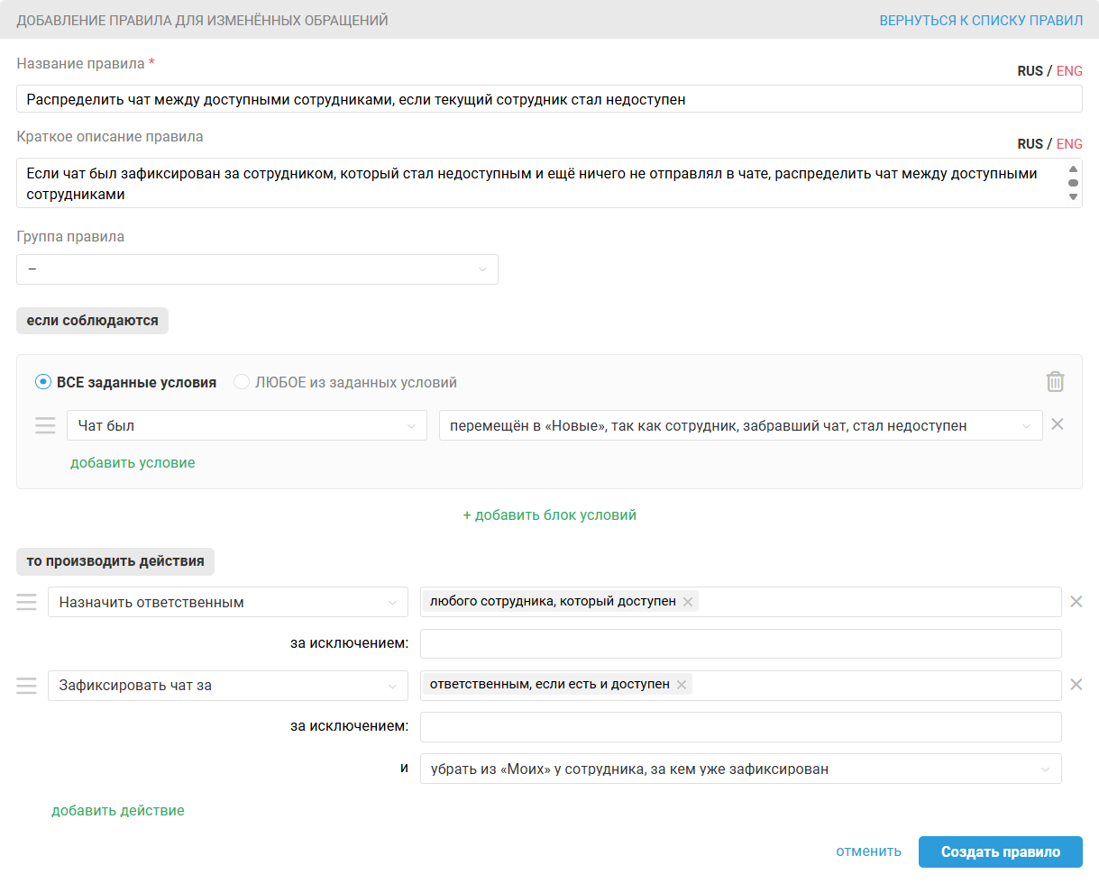 Чтобы во втором случае чаты не просто перешли во вкладку «Новые», а сразу распределились между доступными сотрудниками, создайте правило для изменённых обращений с соответствующим условием.