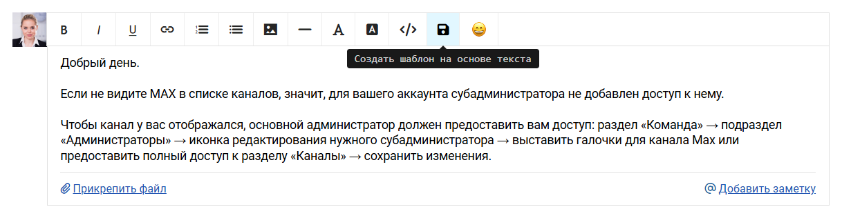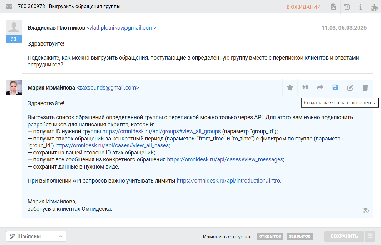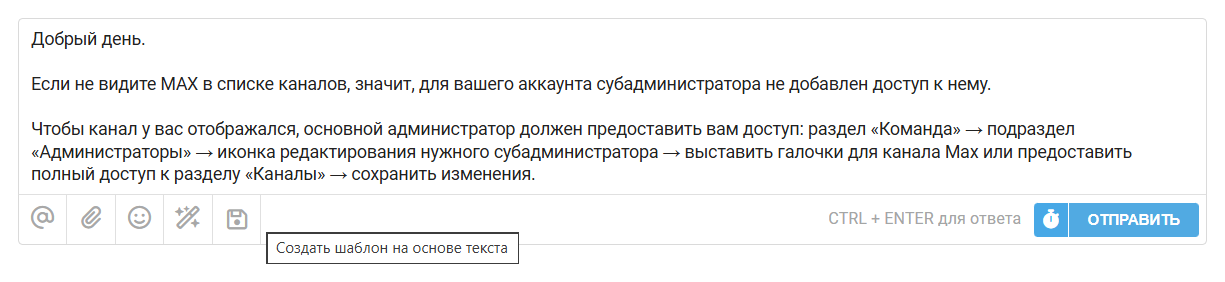 Чтобы быстро создать шаблон из удачного ответа или заметки, достаточно кликнуть на соответствующую кнопку в поле для написания ответа или заметки.