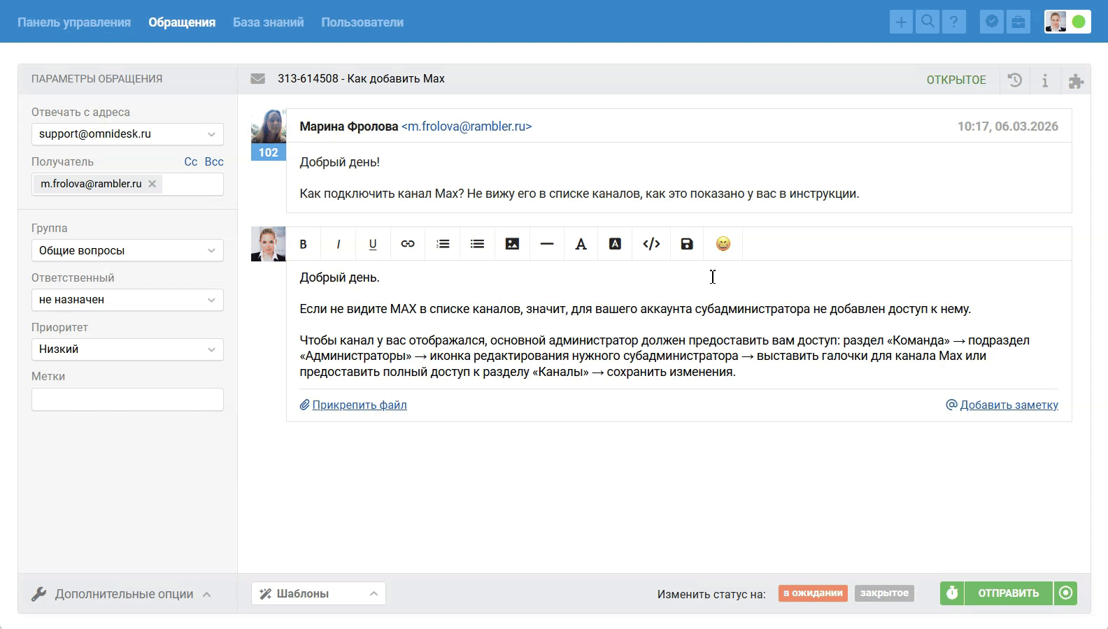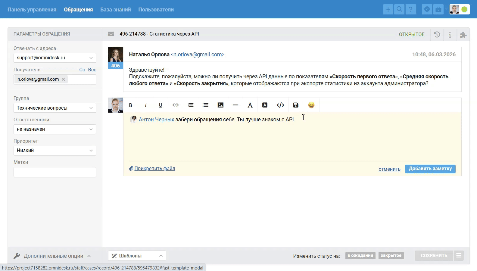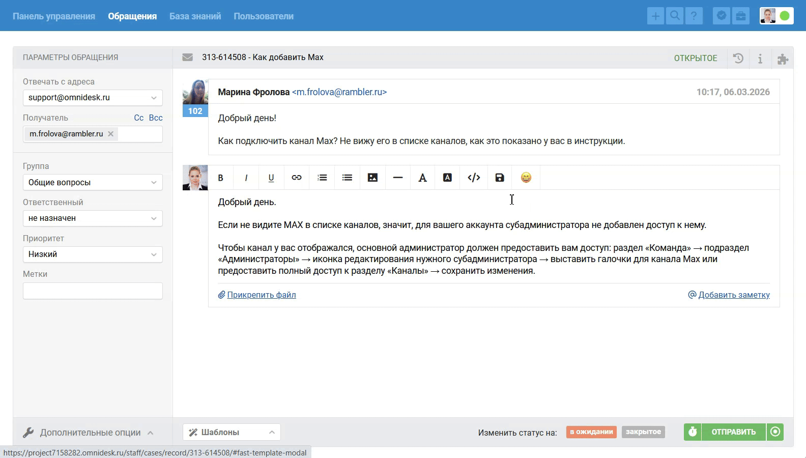 Шаблоны добавляются в соответствующих подразделах аккаунтов администратора или сотрудника. Но если сотрудник подготовил хороший ответ, который пригодится в будущем, можно быстро сохранить его в личные шаблоны прямо со страницы обращения.
