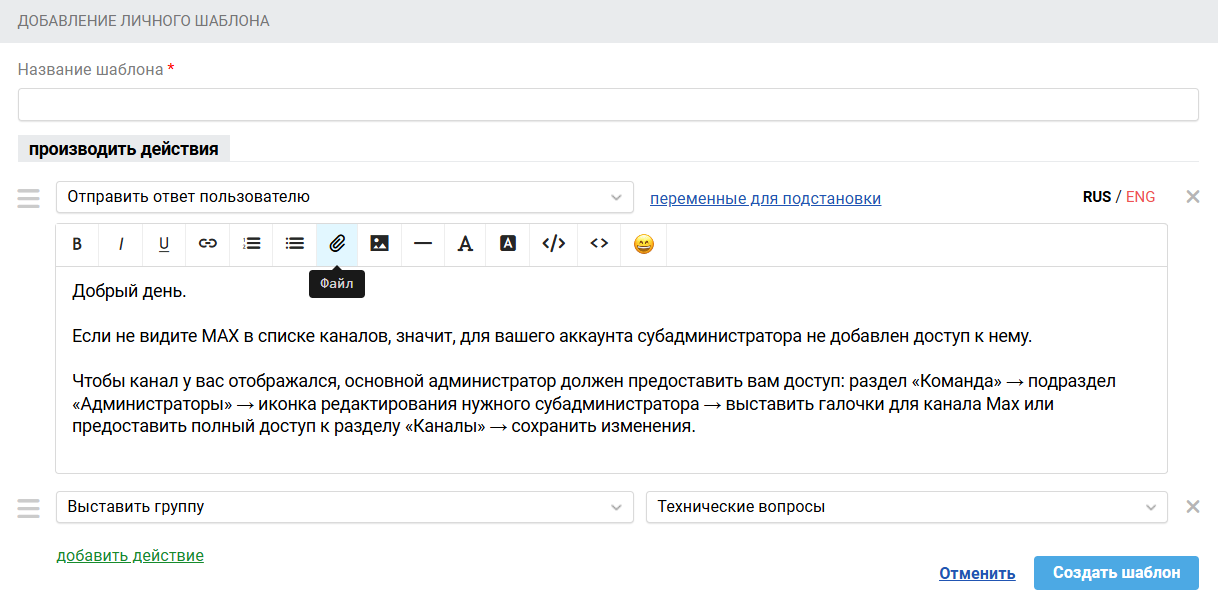 а) Если кликнуть на кнопку в поле написания ответа, откроется модальное окно для создания шаблона с действием «Отправить ответ пользователю».