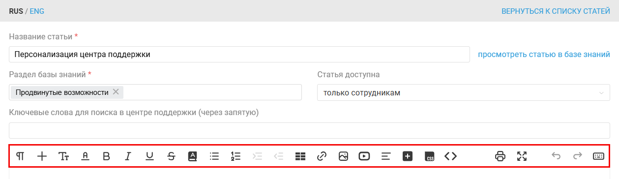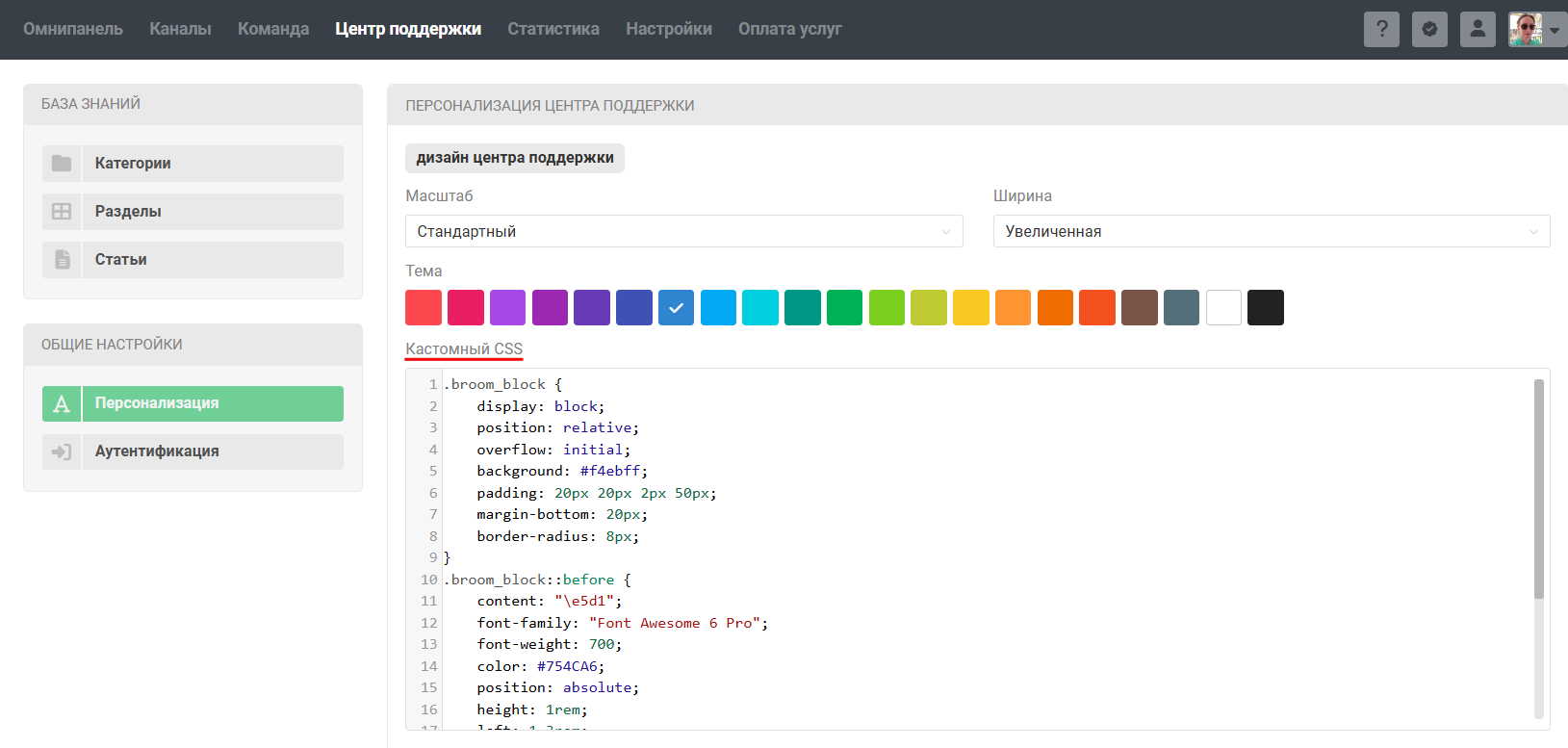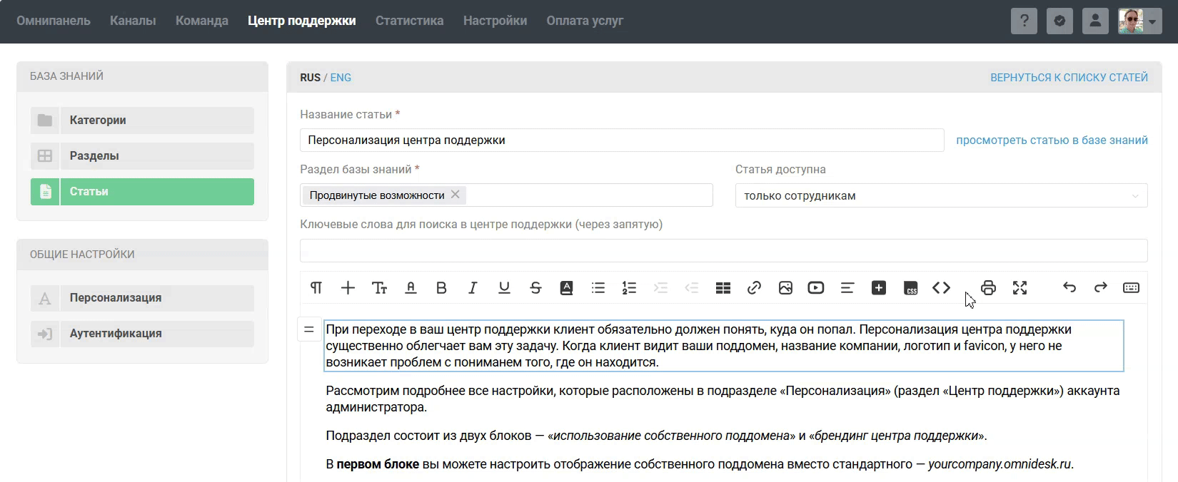 Статья о персонализации центра поддержки доступна в базе знаний вашего центра поддержки, который вы получаете после регистрации. Чтобы прочесть предварительно добавленные статьи или добавить новую, перейдите в аккаунт администратора — раздел «Центр поддержки» — подраздел «Статьи»