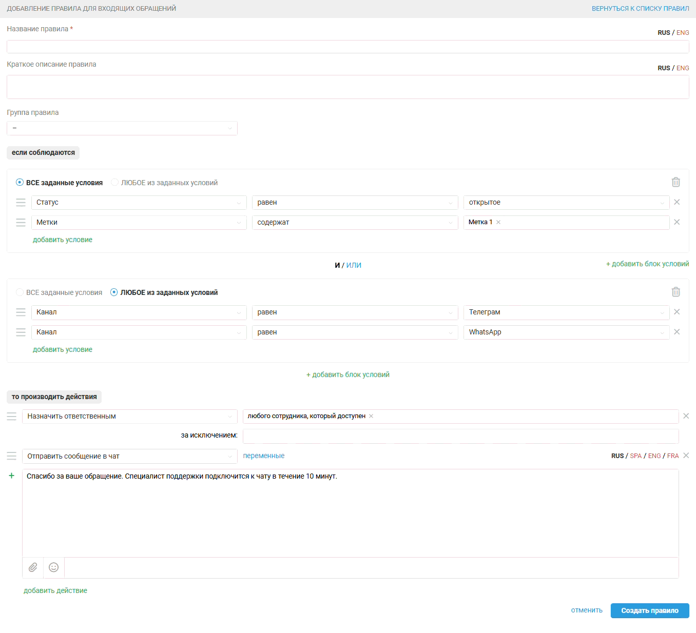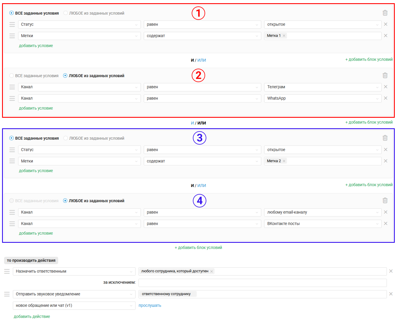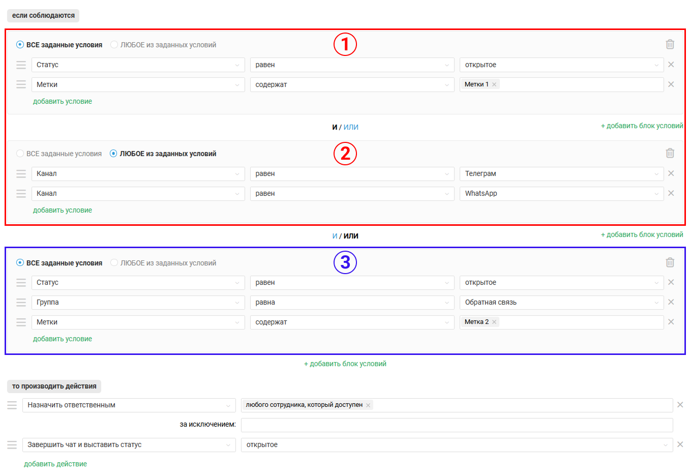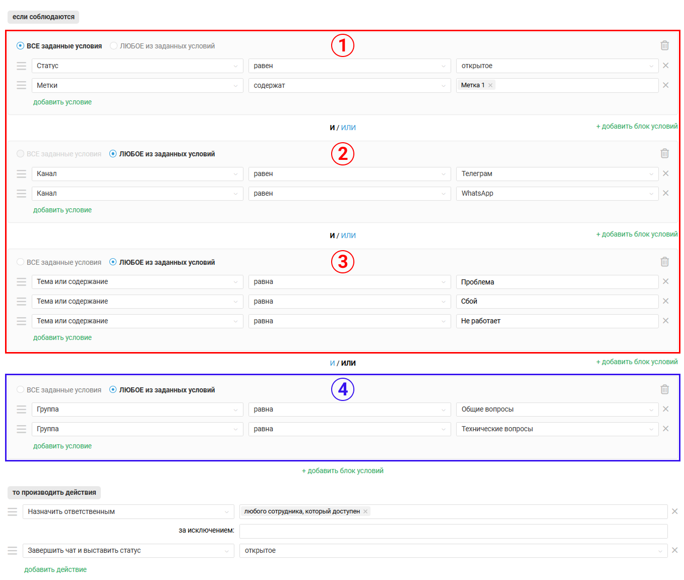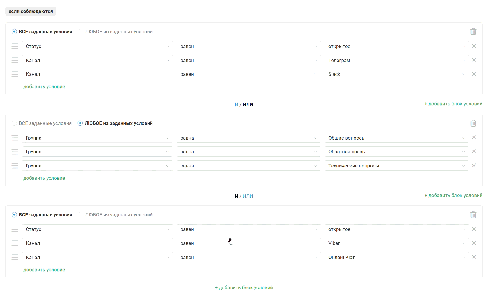 Если нужно было проверять несколько разных наборов условий в блоке «ЛЮБОЕ из заданных условий», приходилось создавать отдельные правила. Например, чтобы отправлять одинаковый автоответ клиентам в нерабочее время и в праздники, но только для обращений определенных групп, требовалось два отдельных правила.