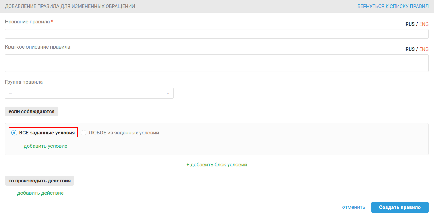 Мы автоматически обновили все существующие правила под новую систему с блоками условий. Если старая логика вас устраивала и вы не хотите ничего менять, при редактировании старых правил или создании новых: