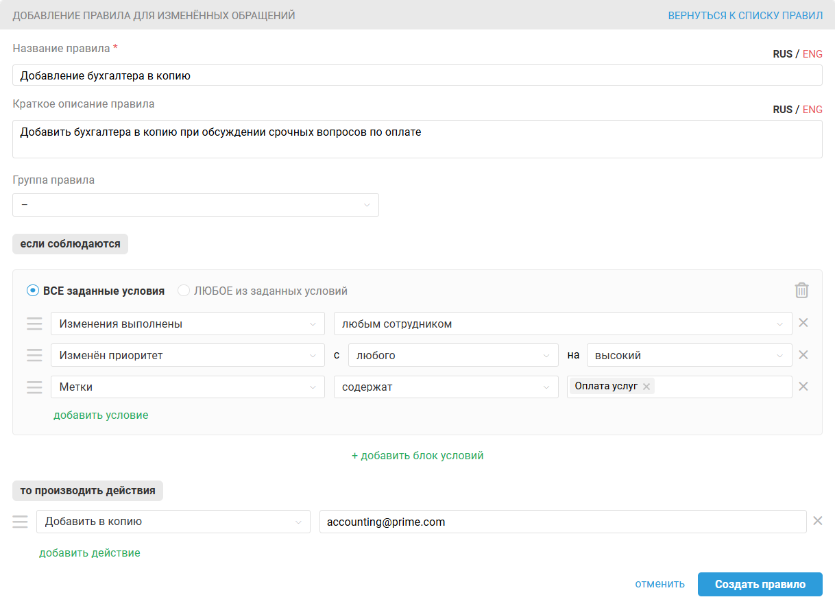 15. Во всех типах правил появились два новых действия: «Добавить в копию» и «Добавить в скрытую копию» — на случай, если требуется добавить адреса в копии, когда обращение соответствует условиям правила.