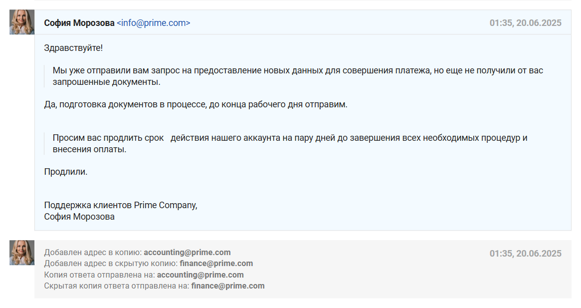 Дублирование на второй адрес. Клиент обратился за помощью и попросил отправлять ответы как на рабочую, так и личную почту. Вы указываете его личный адрес в копии (Cc), чтобы он смог отвечать с любого ящика и в каждом из них видеть всю переписку.