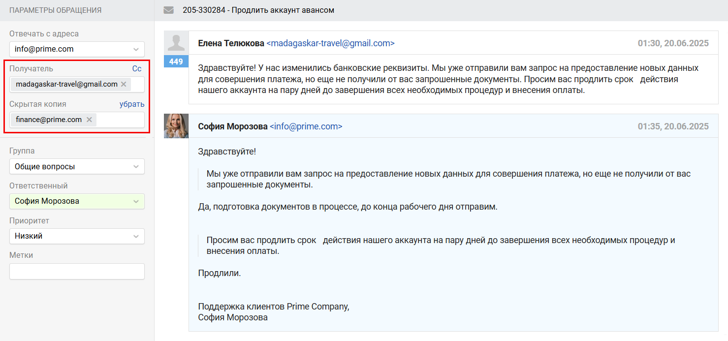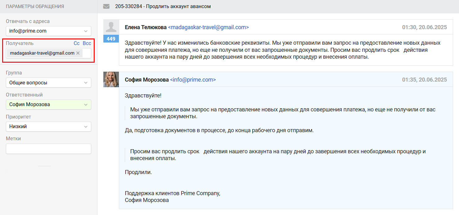 То есть в зависимости от задачи сотрудник сможет либо обновить список получателей и продолжить переписку в рамках текущего обращения,