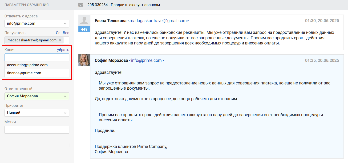 10. Поддержка копий работает и в обратном направлении. Если пользователь отправляет запрос (или новый ответ в текущую переписку) и добавляет другой адрес в Cc, мы автоматически прописываем этот адрес в поле «Копия», чтобы при ответе сотрудника письмо отправлялось на оба адреса.